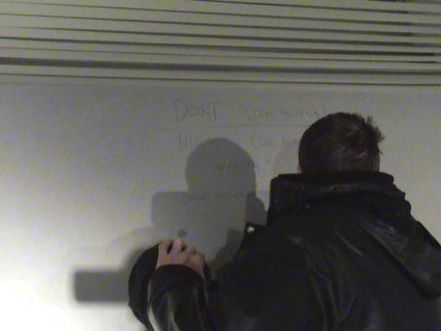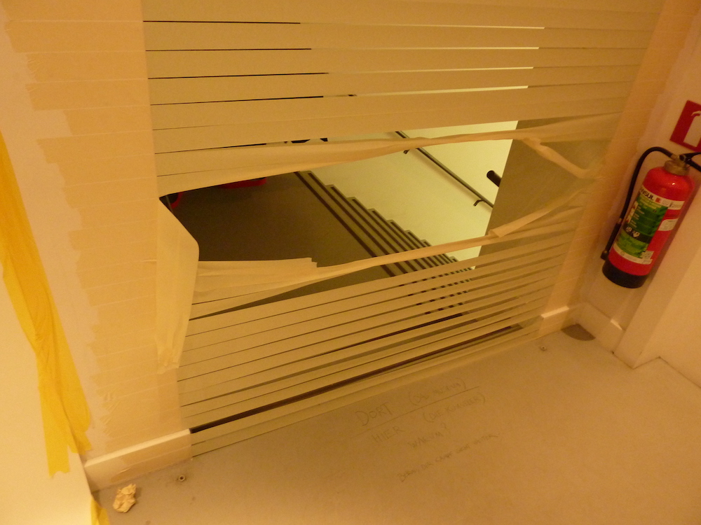 Tijdens een hommage-avond voor kunstenaar Bernd Lohaus reconstrueerde ik een van zijn werken. De doorgang tussen de cafetaria waar het evenement plaatsvond en het museum plakte ik af met stroken plakband. Niemand kon nog voorbij zonder het werk te beschadigen. Op de grond schreef ik: During a memorial event for artist Bernd Lohaus I reconstructed one of his works. I blocked the doorway between the cafetaria, where the event took place, and the museum with strips of tape. Nobody could pass through without destroying the work. On the floor I wrote: | ||