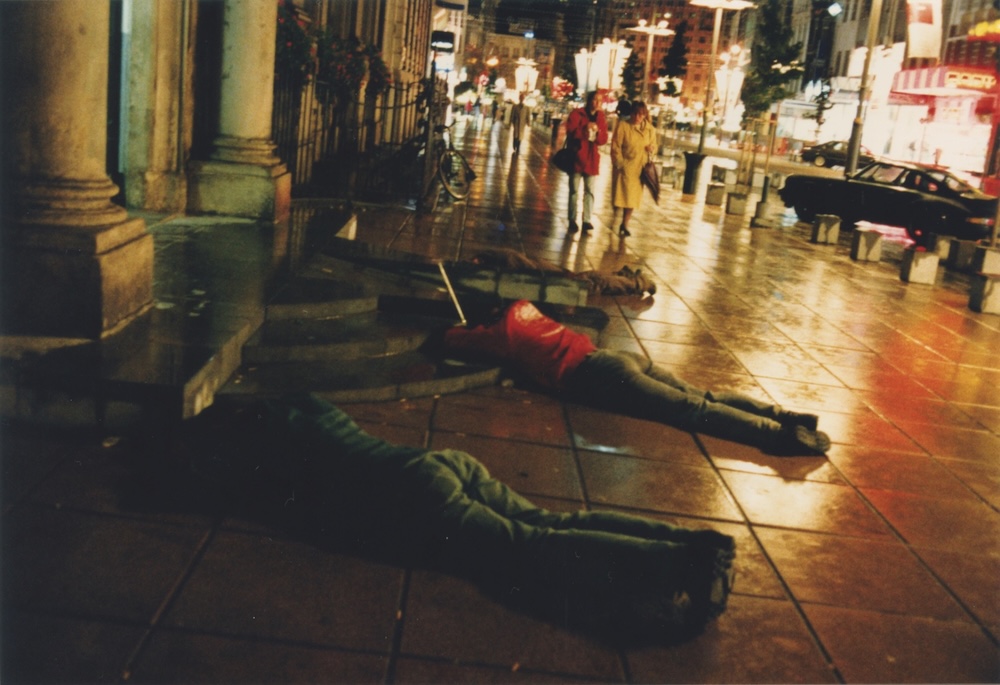 Tijdens de opening van een tentoonstelling over kunstenaarsinitiatieven en de aanwezigheid van internationale kunstenaars in Antwerpen lagen diverse kunstenaars buiten op het trottoir. At the opening of an exhibition about artist spaces and the presence of international artists in Antwerp several artists lay outside on the sidewalk. | ||