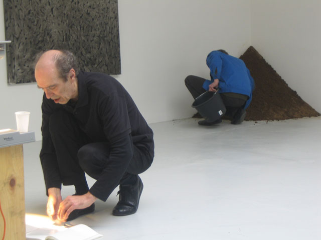 Tijdens een voordracht van Walter Swennen over zijn werk smokkelde ik achter zijn rug emmers zand uit mijn put binnen om er een ‘zandhoek’ mee te maken. During a lecture by Walter Swennen about his work I smuggled in buckets with earth from my hole behind his back to make a ‘sand corner’ with it. | ||