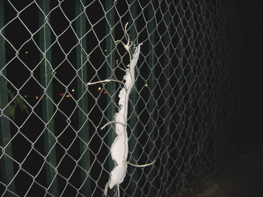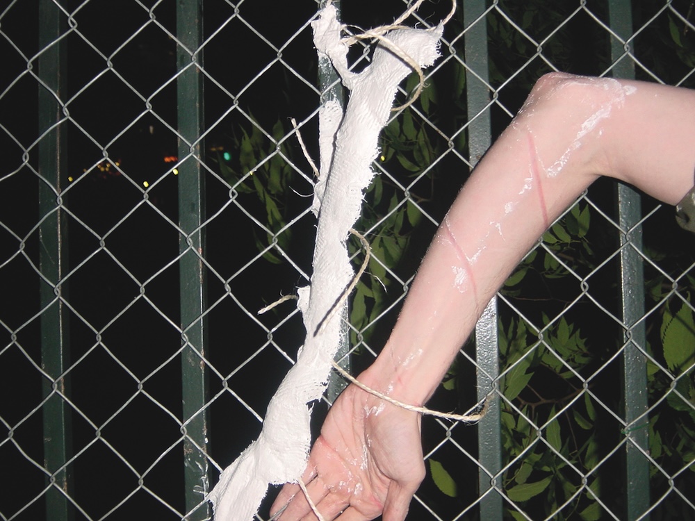 Op diverse plaatsen bond ik mijn arm of been tegen de tak of stam van een boom of tegen een metalen hek met stukken touw of klimop. Daarna legde ik een plaasterverband over alles heen. Ik sneed mijzelf dan los en liet het plaasteren afgietsel hangen. On various locations I tied my arm or leg to a branch or foot of a tree or to a metal fence with a piece of rope or hedera. Then I put a plaster cast over everything. I cut myself loose and left the plaster cast behind. | ||