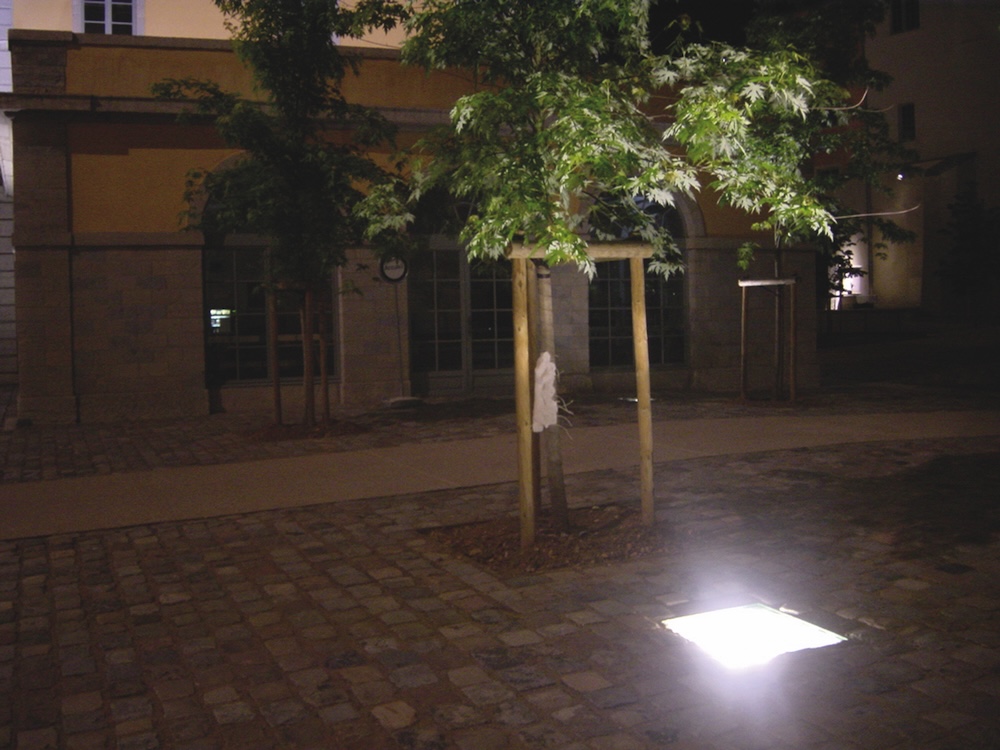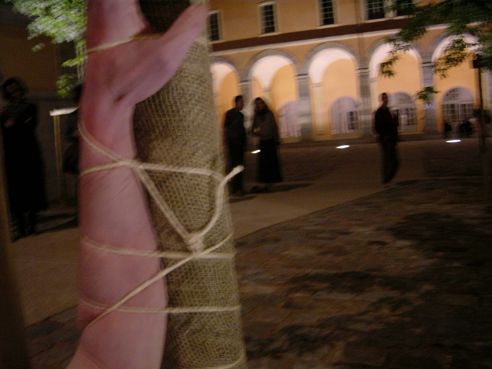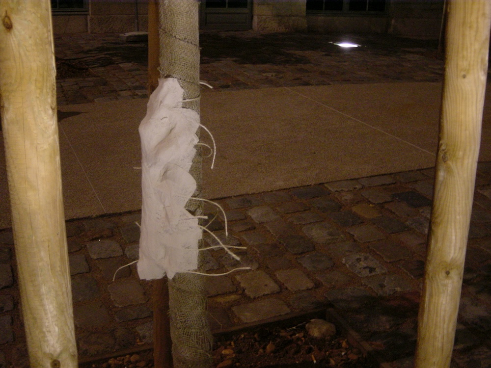 Op diverse plaatsen bond ik mijn arm of been tegen de tak of stam van een boom of tegen een metalen hek met stukken touw of klimop. Daarna legde ik een plaasterverband over alles heen. Ik sneed mijzelf dan los en liet het plaasteren afgietsel hangen. On various locations I tied my arm or leg to a branch or foot of a tree or to a metal fence with a piece of rope or hedera. Then I put a plaster cast over everything. I cut myself loose and left the plaster cast behind. | ||
