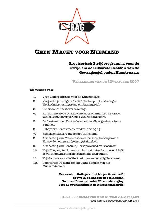 Op een discussieforum over ‘Het Metabolisme van de Macht’ deed ik de uitbuiting van kunstenaars door het museum uit de doeken aan de hand van financiële cijfers uit het jaarverslag. Verder wilde ik de deelnemers aan het debat en het publiek bestoken met zelfgemaakte explosieve cocktails van Coke Light en Menthol. De belangstelling voor het evenement bleef echter beperkt tot 8 mensen waardoor elke mogelijkheid tot interactie vruchteloos bleek. At a discussion forum about ‘The Metabolism of Power’ I explained the exploitation of artists by the museum with financial details from the annual report. Furthermore I planned to fire self-made explosive cocktails of Coke Light and Menthol at the other participants in the discussion and members of the audience. Alas the interest for the event was limited to 8 people which made every possibility to interaction fruitless. | ||