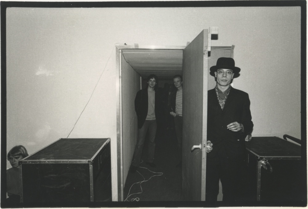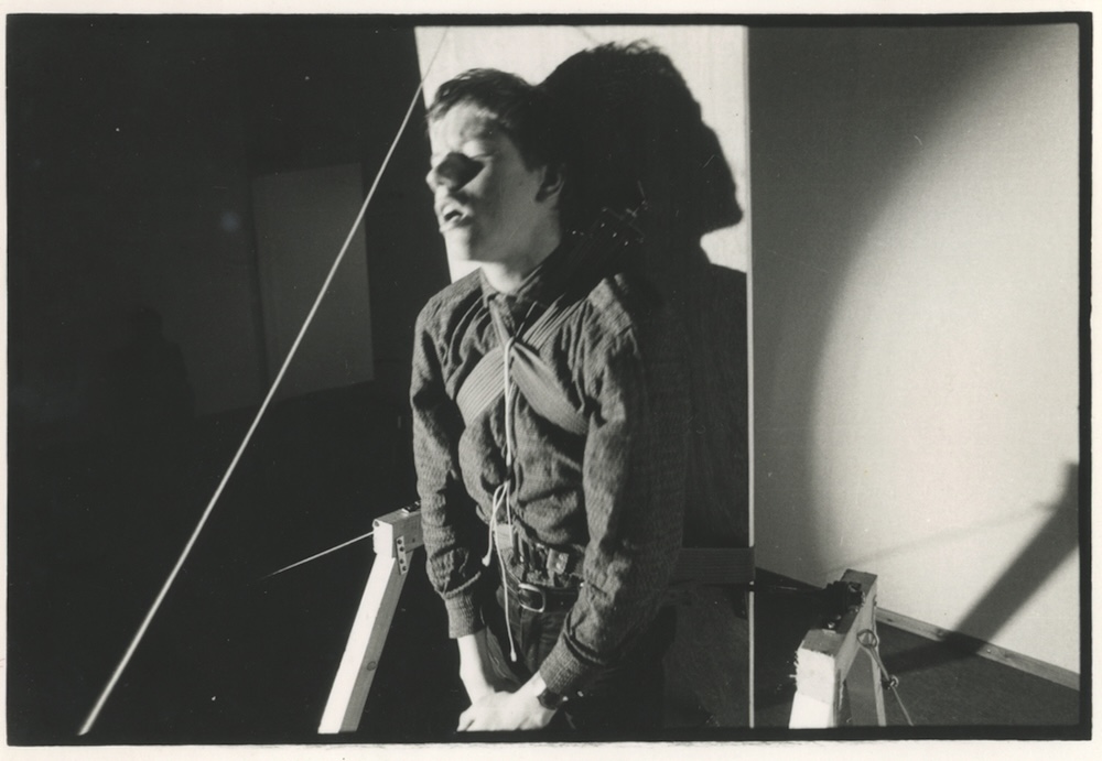 Ik lag vastgebonden op een tafel die ik op eigen kracht 360° kon laten ronddraaien. In de kamer ernaast waar het publiek zich bevond werden dia’s van industriële landschappen getoond. De deur tussen de twee kamers werd voortdurend geopend en weer dichtgegooid zodat telkens slechts enkele mensen een glimp van de performance konden opvangen. Als de deur dicht was kon je luide monotone muziek horen als ze open was hoorde je niets. I was tied to a table which I could turn over 360° by my own power. In the room next door where the public was slides of industrial landscapes were shown. The door between the two rooms was continuously opened and slammed back so only a few people could have a glance at the performance inside each time. When the door was closed you could hear loud monotone music when it was open you didn’t hear anything. | ||