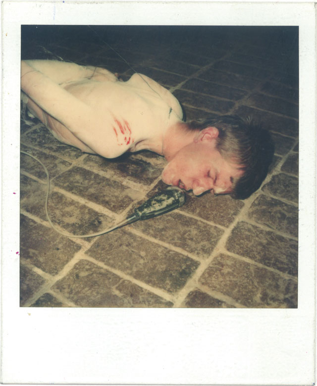 Terwijl de Simpletones hun muziek speelden lag ik op de grond met een ijzerdraad strak om mijn nek gespannen. In een microfoon herhaalde ik met verstikte stem: “I wanna be injured”. While the Simpletones played their music I was laying on the floor with an iron wire tight around my neck. In a microphone I repeated with stifled voice: “I wanna be injured”. | ||