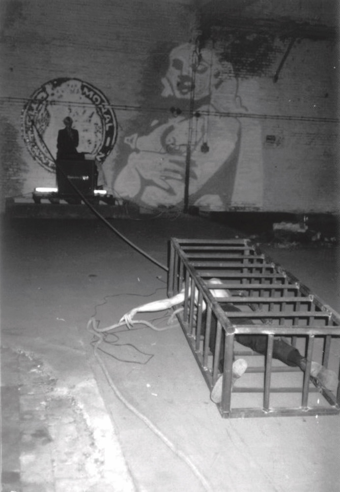Ik zat opgesloten in een metalen kooi. Terwijl AMVK een tekst over wilskracht voorlas trok ik mijzelf met de kooi aan een touw vooruit. Het geluid van de over de grond voortschurende metalen kooi werd electronisch versterkt. I was locked in an iron cage. While AMVK read a text about willpower I pulled myself forward with the cage by a rope. The sound of the iron cage dragging across the floor was electronically amplified. | ||