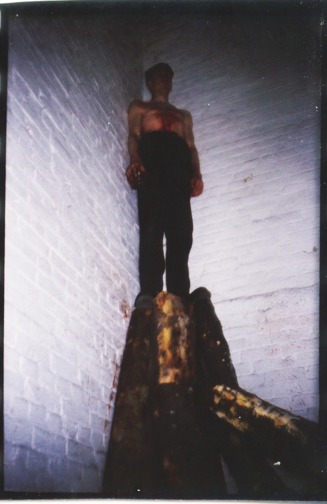 Op een boomstronk staande las ik bekentenissen van meervoudig moordenaar en kannibaal Karl Friedrich Großmann voor, daarna goot ik bloed over mijn hoofd en liet het over mijn lichaam op de boomstronk stromen. Standing on a tree stump I read confessions from multiple murderer and cannibal Karl Friedrich Großmann, then I poured blood over my head and let it run down over my body onto the tree stump. | ||