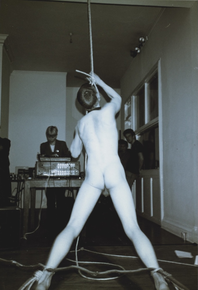 Een variatie op de L’Age d’Or performance waarbij mijn voeten aan de grond waren vastgemaakt en ik mijzelf door middel van een katrol en een touw om mijn nek van de grond probeerde te trekken. Door een pilotenmicrofoon herhaalde ik steeds “I wanna be injured”, het geluid werd door AMVK electronisch vervormd. A variation on the L’Age d’Or performance where my feet were tied to the floor and I tried to pull myself off the ground via a pulley and a rope around my neck. Using a throat-microphone I repeated “I wanna be injured”, the sound was electronically distorted by AMVK. | ||