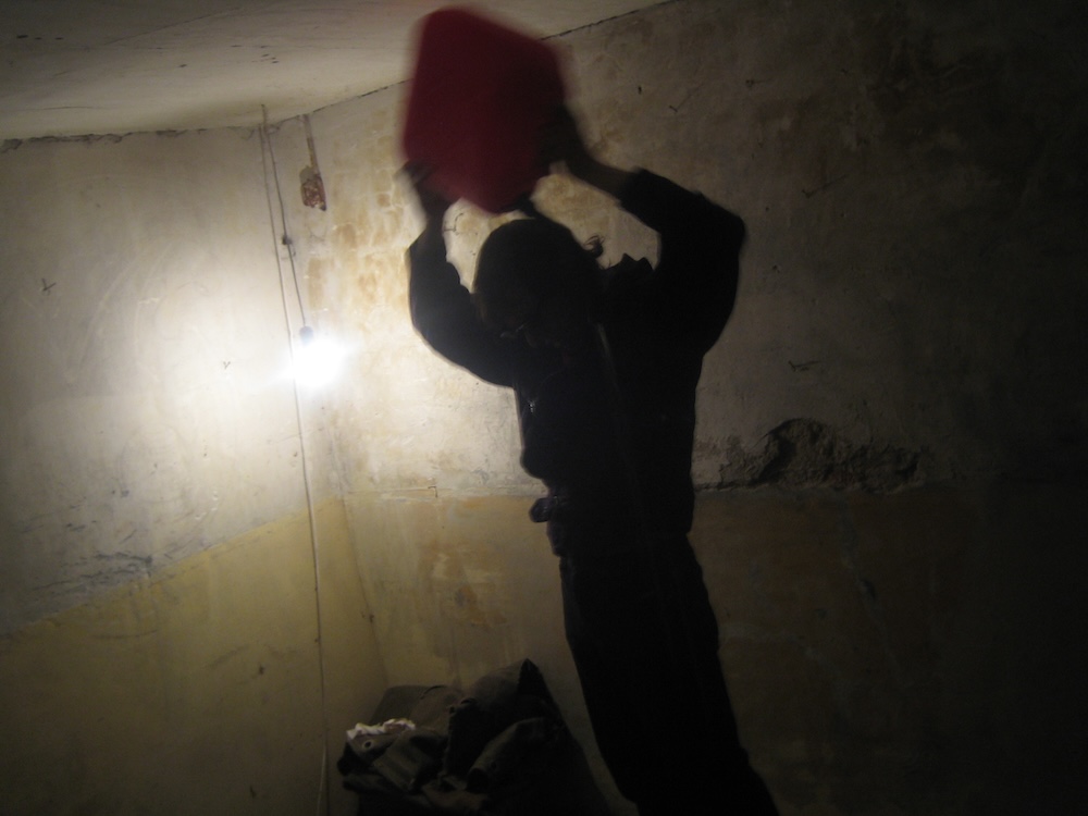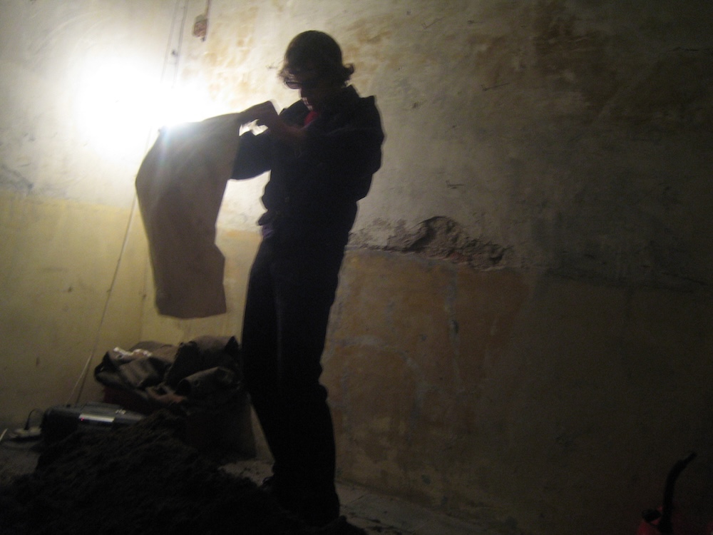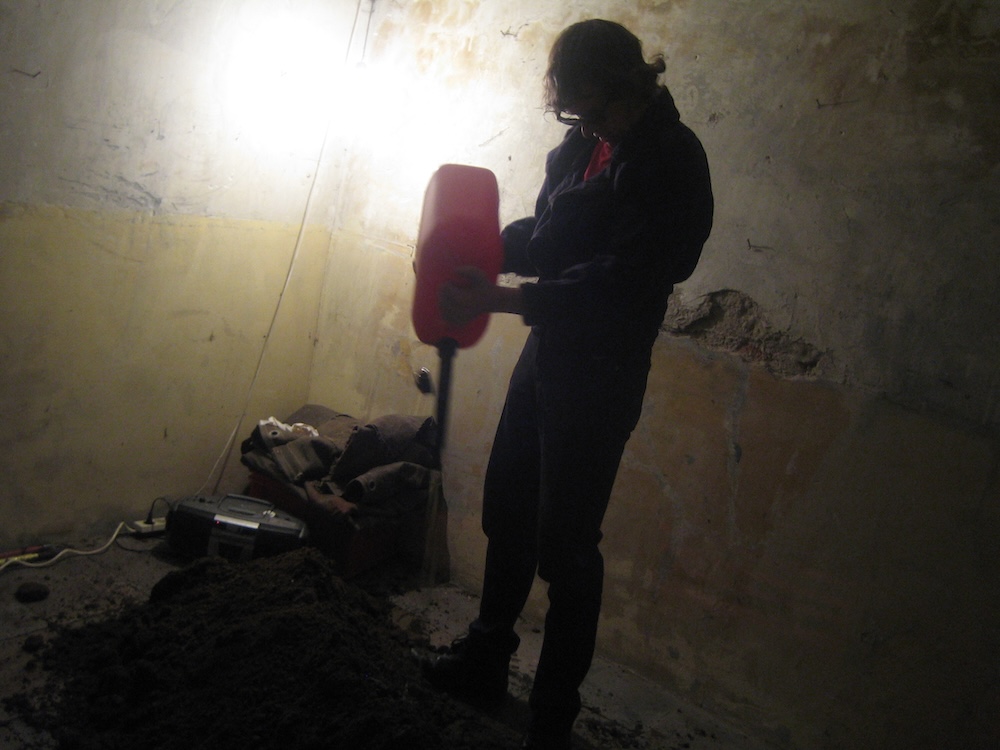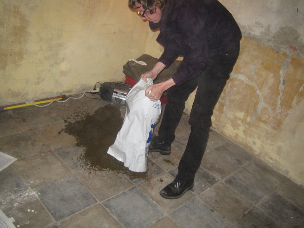 Ik transporteerde een hoop zand in plastic zakken uit mijn put naar de kunstruimte. Gekleed in een 1970 outfit en met zonnebril deelde ik een pamflet uit aan de toeschouwers. Terwijl een lange versie van ‘Macht kaputt was euch kaputt macht!’ door Ton Steine Scherben door een ghettoblaster klonk gooide ik het zand op de grond in een verdedigingswal. Dan goot ik een blik benzine uit over mijn hoofd. Ik mengde de benzine met het zand uit mijn put tot kleine projectielen waarmee ik de toeschouwers bekogelde. I transported a mass of earth in plastic bags from the hole to the art venue. Dressed in a 1970’s suit and wearing sunglasses I handed out a pamphlet to members of the audience. While an extended version of ‘Macht kaputt was euch kaputt macht!’ by Ton Steine Scherben played loud through a ghettoblaster I poured the earth onto the floor in a defensive wall structure. Then I poured a can of petrol over my head. Mixing the petrol with earth from the hole I made small muddy projectiles which I threw at the audience. | ||