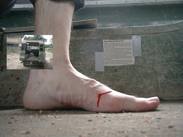 In an abandoned LandRover I took off my shoes and made an incision in my foot. The above newspaper article I left behind.