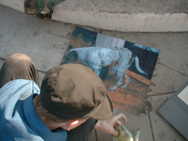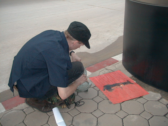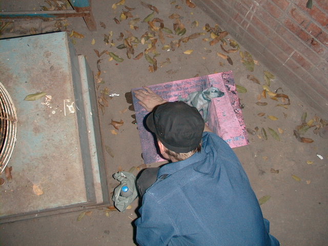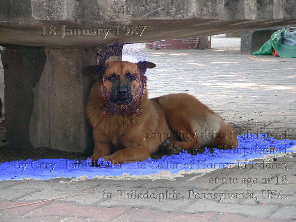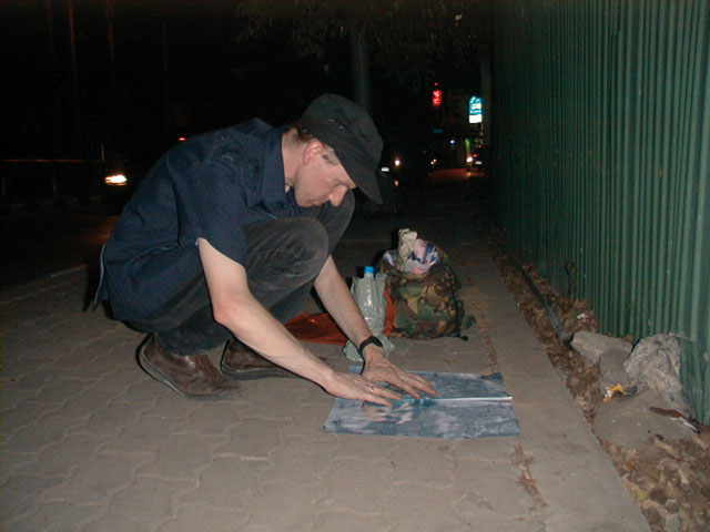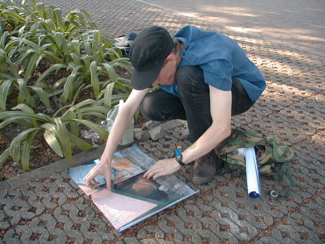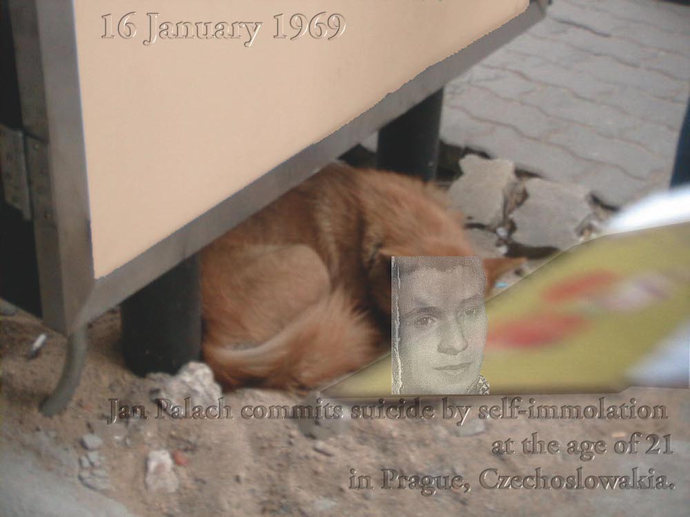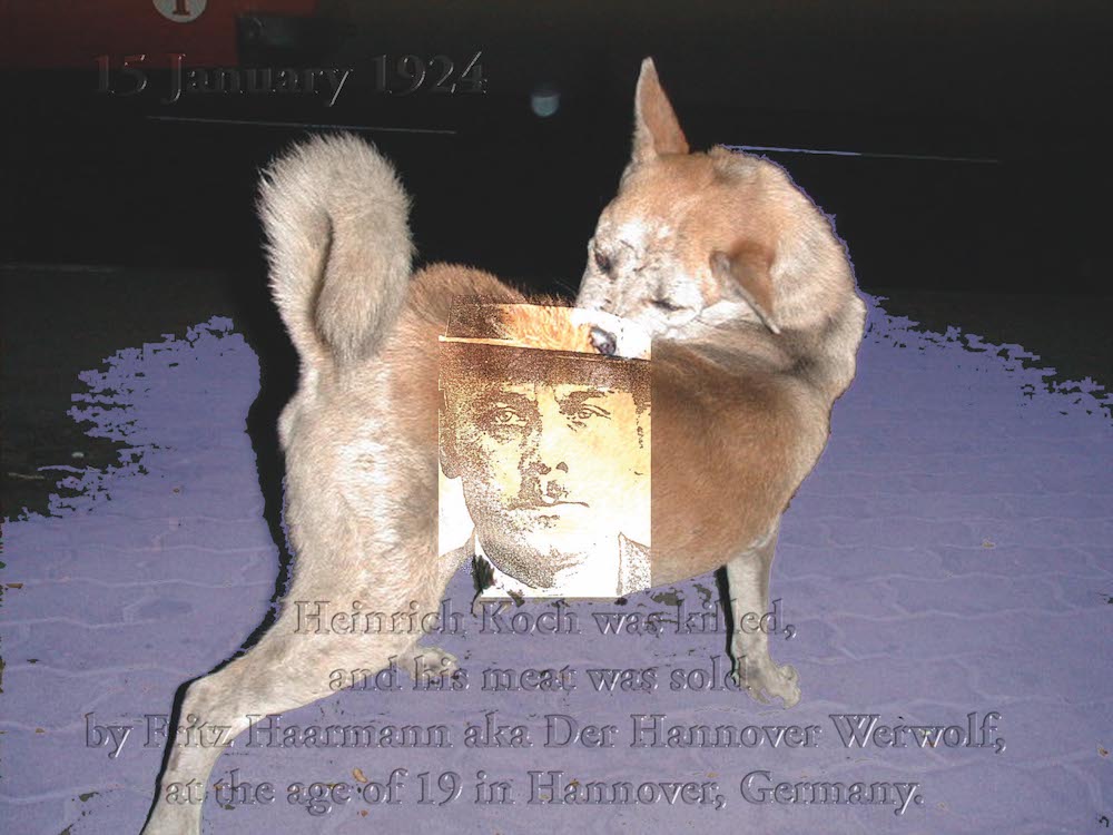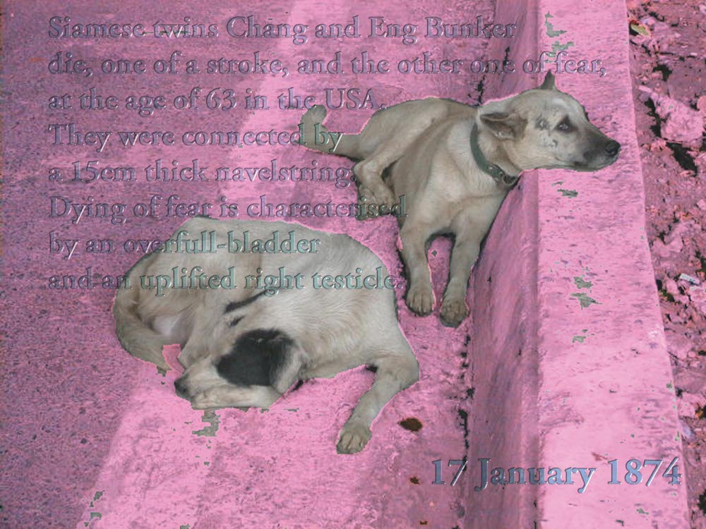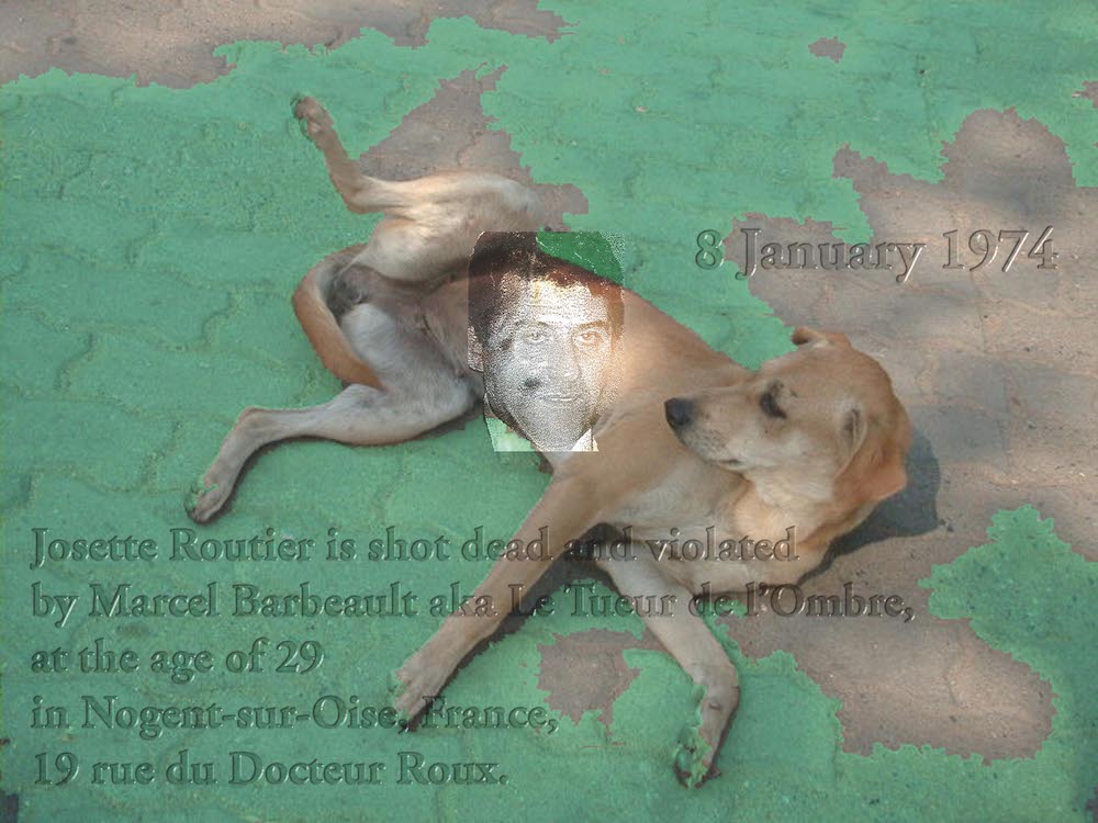 Gedurende enkele weken maakte ik foto’s van rondzwervende straathonden terwijl ik zelf door de stad zwierf. I maakte grote prints van de foto’s aangevuld met tekst over de dag in het verleden waarop ik de foto’s had gemaakt. Ik kleefde de foto’s op de voetpaden tijdens mijn zwerftochten door de stad. For several weeks I made photos of roaming streetdogs while I was roaming the city myself. I made large prints of the photos and added text about the day in the past when I made the photos. I pasted the photos on the pavement during my roamings through the city. | ||