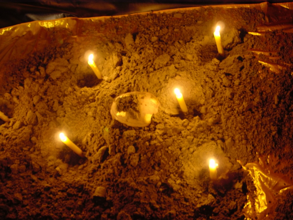 Tijdens het zoeken naar plekken om van het zand uit mijn put af te geraken stootte ik toevallig op de lege graftombe van James Lee Byars. Ik heb ze helemaal met zand gevuld zodat ze geheim bleef. While looking for places to get rid of the earth from my hole I accidently found the empty tomb of James Lee Byars. I filled it completely with earth so it was kept secret. | ||