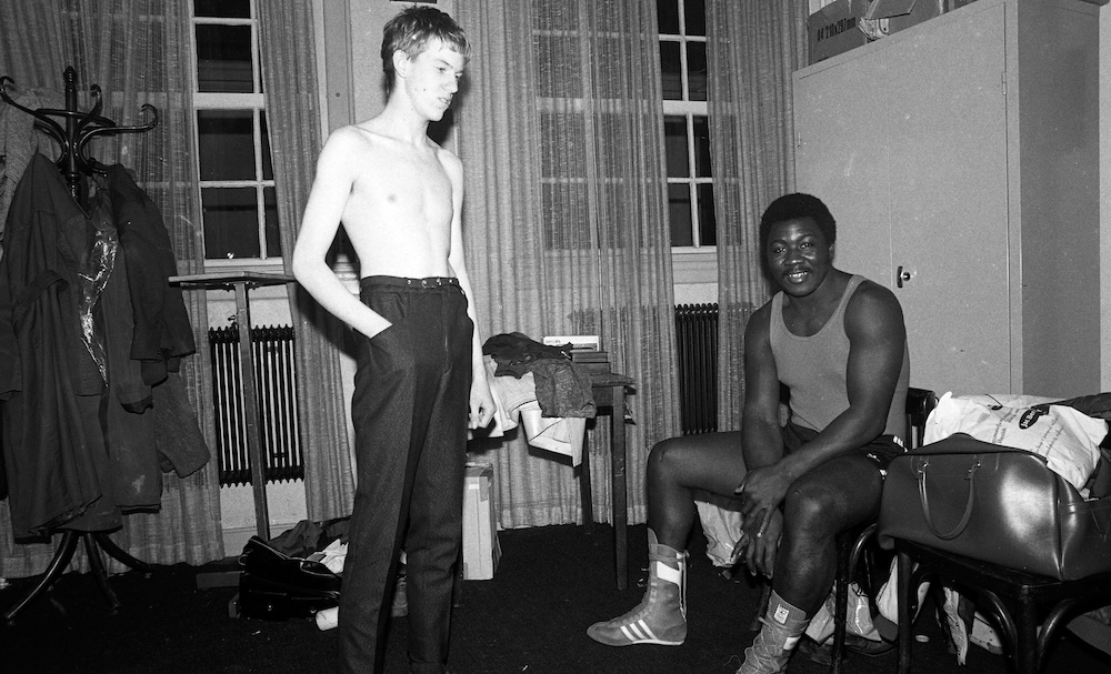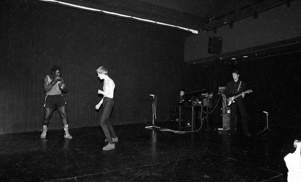 Terwijl de Simpletones hun muziek speelden werd ik door een speciaal ingehuurde professionele zwarte zwaargewicht bokser op een podium geslagen zonder dat ik mij verzette. While the Simpletones played their music I was beaten around by a specially hired professional black heavyweight boxer on a stage without any resistance of me. | ||