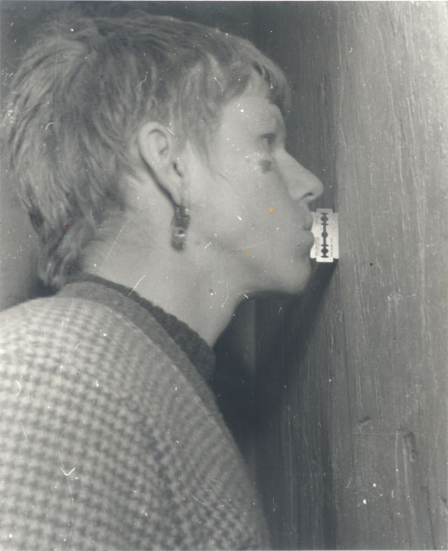 Ik stond tegen een muur. Een scheermesje zat geklemd tussen mijn lippen en de muur. Ik bleef staan zo lang ik kon. I stood facing a wall. A razorblade was pressed between my lips and the wall. I stayed as long as I could. | ||
