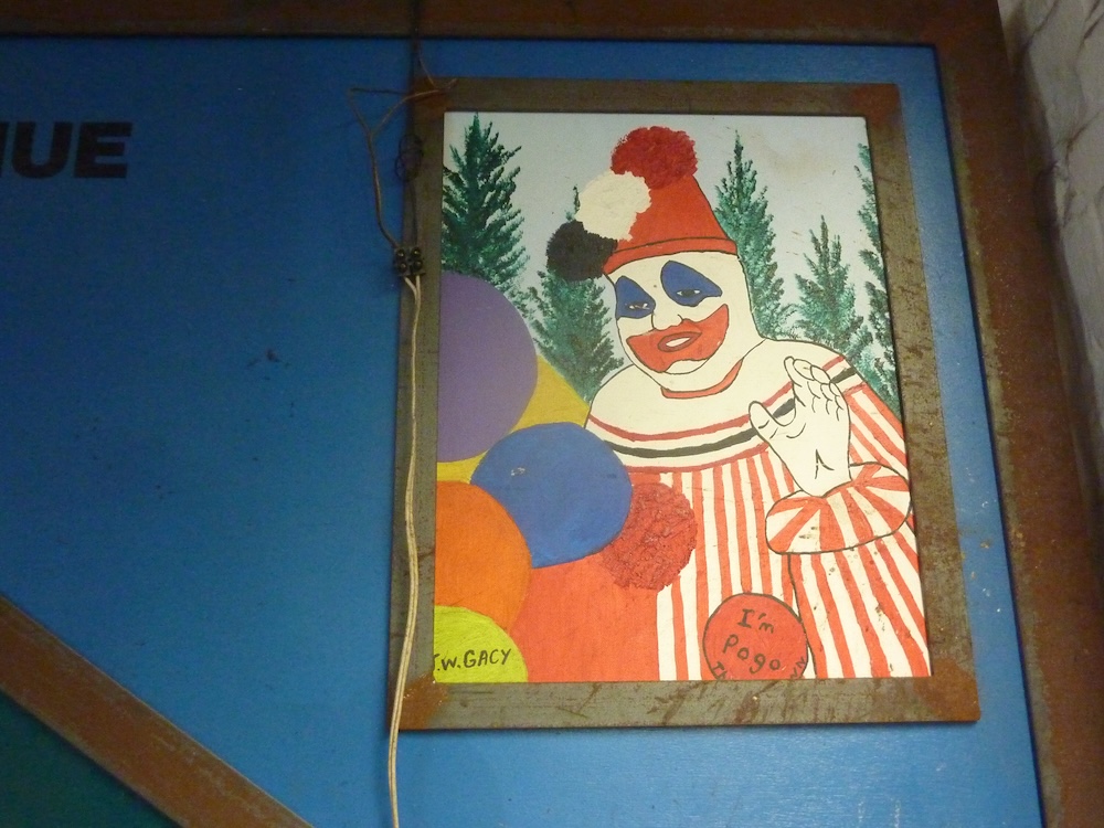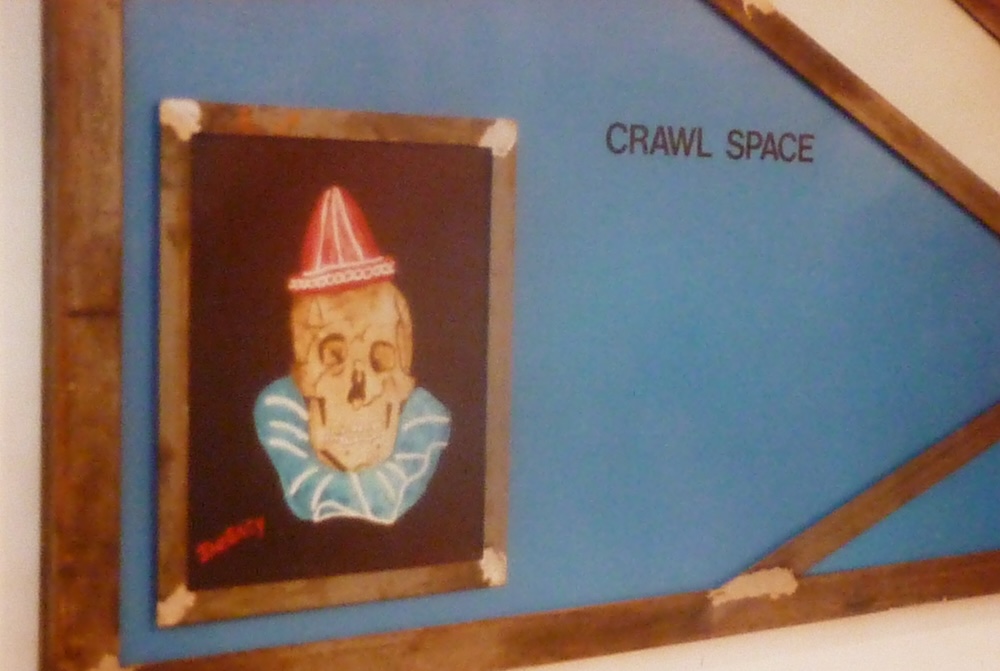 A large heavy metal frame depicts the house and its crawl space of serial killer John Wayne Gacy aka The Killer Clown. John Wayne Gacy (17 March 1942 – 10 May 1994) was an American serial killer and sex offender who raped, tortured and murdered at least thirty-three young men and boys between 1972 and 1978 in Norwood Park Township, a suburb of Chicago, Illinois. He became known as the 'Killer Clown' due to his public performances as a clown prior to the discovery of his crimes. From 28 August 1987 to 12 August 1990 I corresponded with him and bought two of his paintings, 'Pogo the Clown' and 'Skull Clown'. Gacy also sent me several hand painted greeting cards. He also reproduced my first letter in his book 'They Call Him Mr. Gacy', published in 1989 by McClelland Associates. Metal, plywood, paint, two original Gacy paintings, 203cm x 288cm x 6cm. Property of the artist. | ||