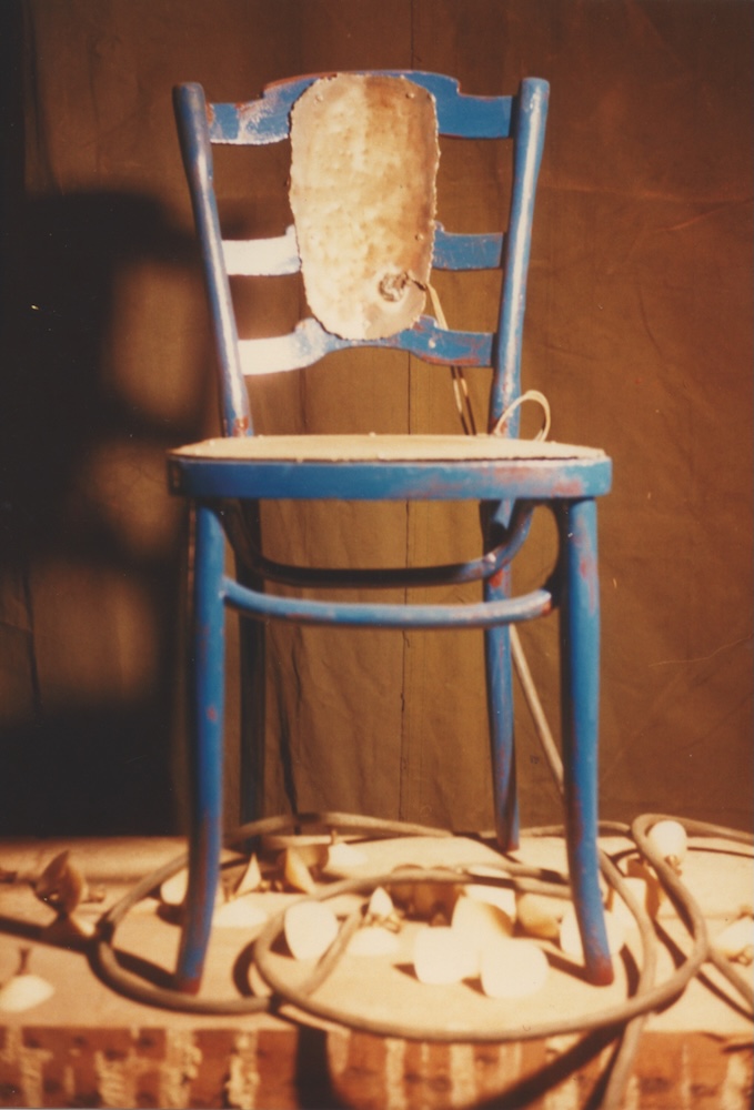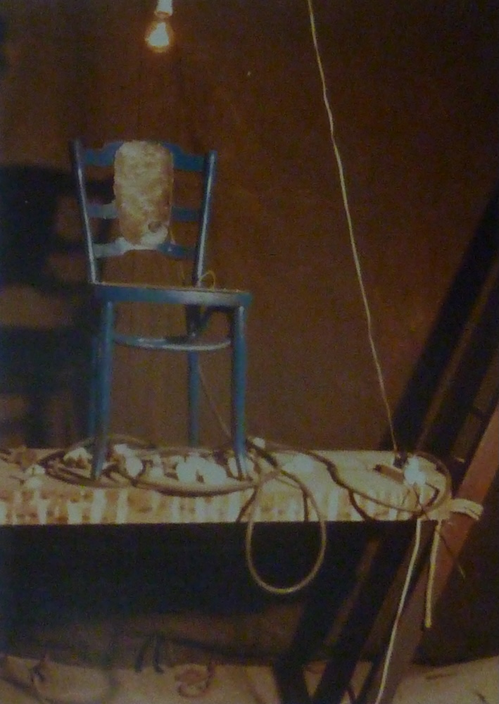 A household chair reworked into an electric chair. Made for an exhibition of weapons for a PrivéMilicia. Metal, wood, electric wire, 88cm x 40cm x 40cm. Collection of Didier Casimiro. | ||