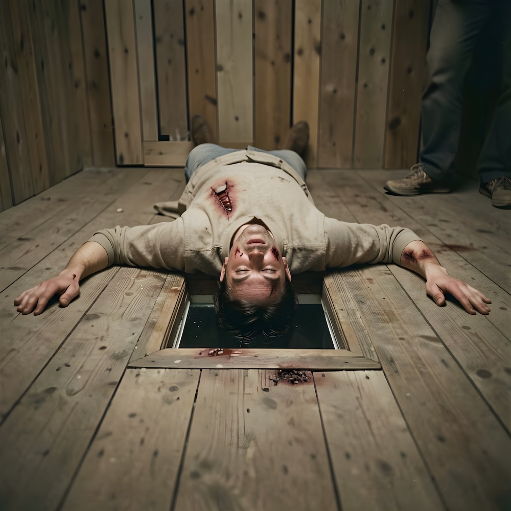 Performance art - 11 January 1979 - During a party I made an installation at the entrance with wooden walls and a wooden floor. I lay under the floor supporting the wood with my body. My head and chest were visible through a window in the floor. Before I had inflicted wounds on my head and chest. After 3 hours I stopped because some spectators were reacting too aggressive. An AI image for my 'Installation - 1' performance. The description above was the prompt for the generated image. An image generated by an AI Machine Learning Model Property of the artist. | ||