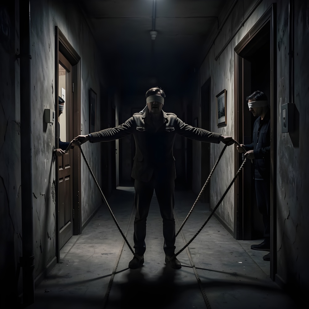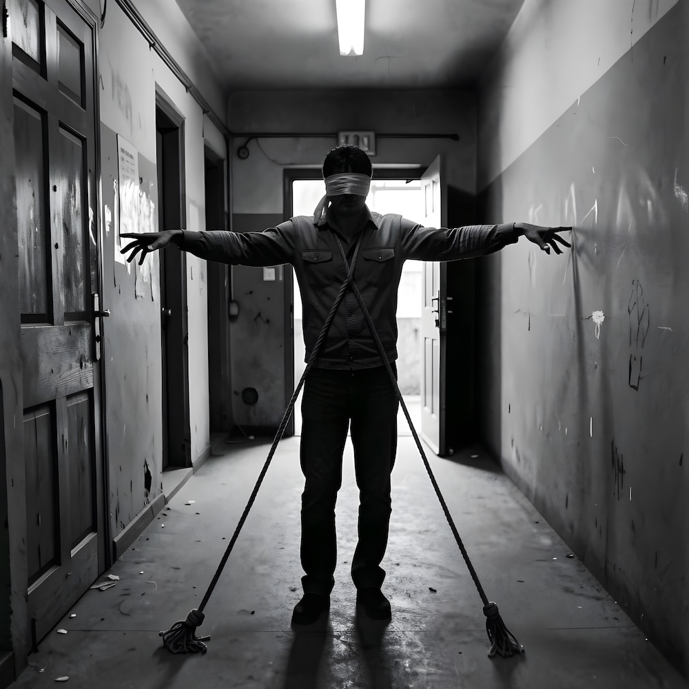 Performance art - 13 May 1979 - I was hanging with my arms spread and blindfolded in a darkened corridor. To my feet ropes were attached leading to the door. Each time somebody entered he/she pulled my body towards him/her. An AI image for my 'Installation - 2' performance. The description above was the prompt for the generated image. An image generated by an AI Machine Learning Model Property of the artist. | ||
