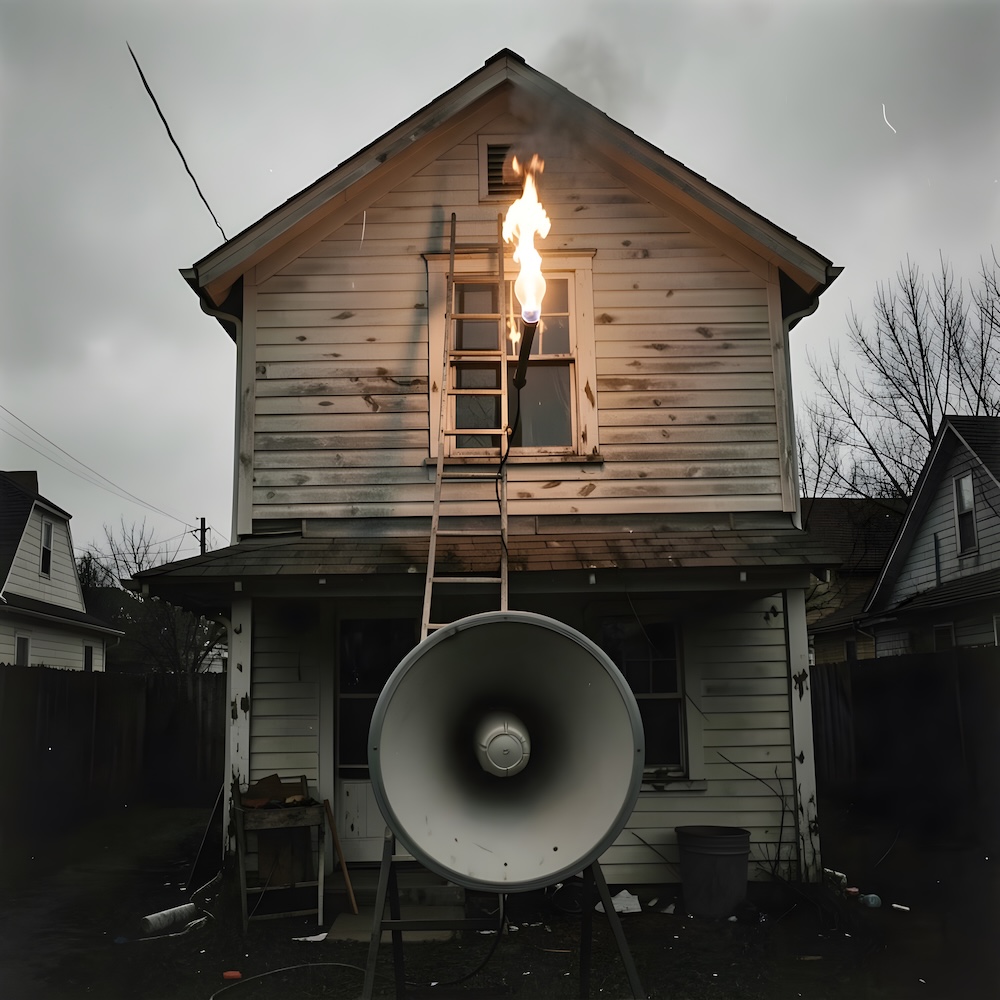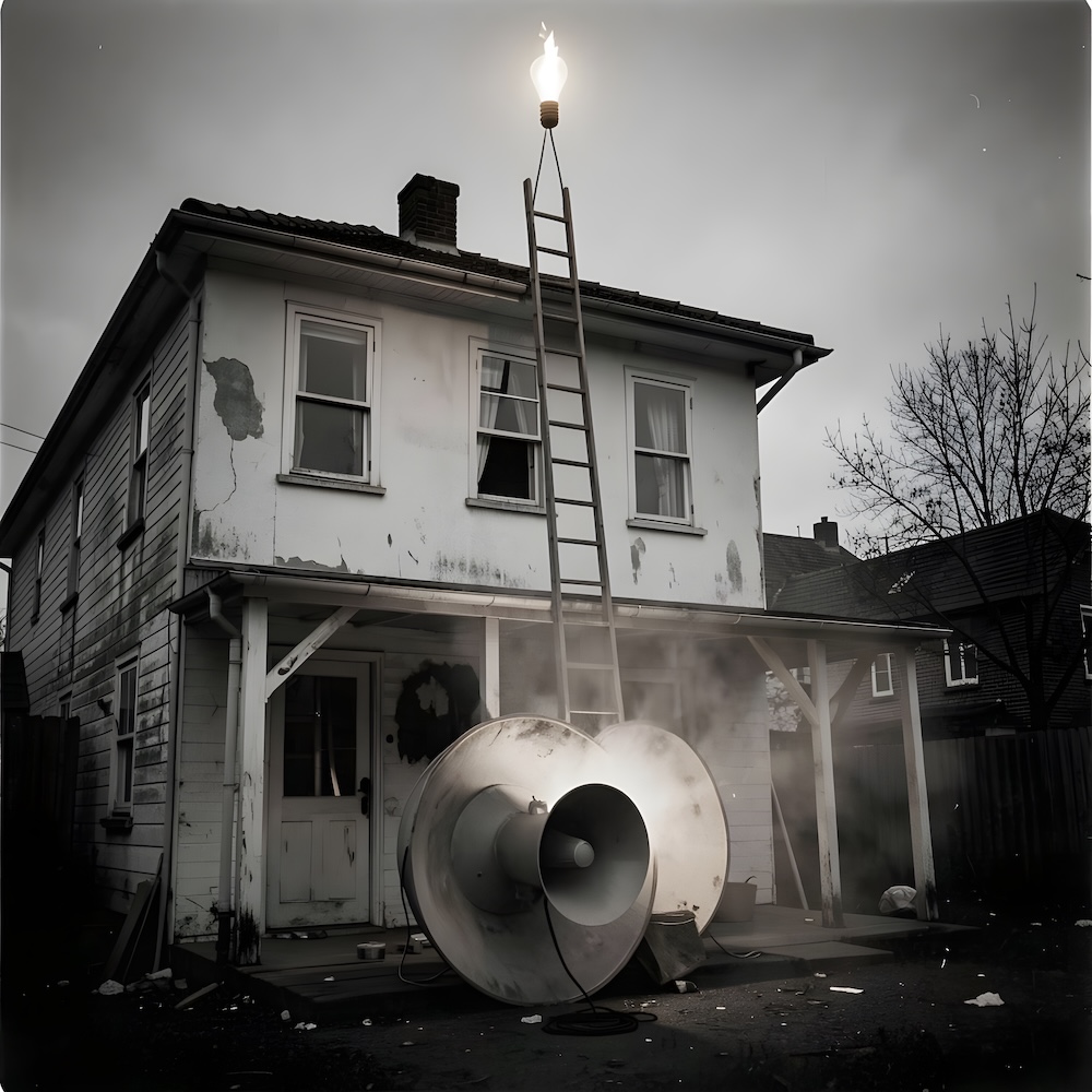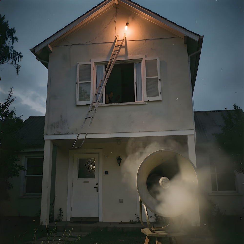 Performance art - 18 June 1979 - My house with two floors: through the window on the second floor a ladder was pointing to the sky a burning lightbulb attached to it. On the first floor was a large loudspeaker producing continuous heavy drones. After two days I had to stop because of complaining neighbours. An AI image for my 'Tonight the Men are Coming Back' performance. The description above was the prompt for the generated image. An image generated by an AI Machine Learning Model Property of the artist. | ||