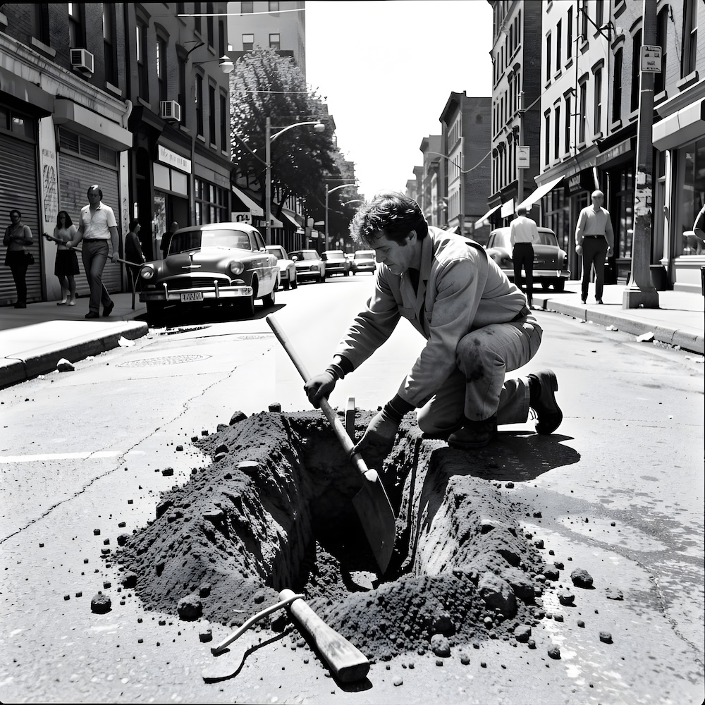 Performance art - 11 July 1979 - When the street was being repaired I took advantage of the situation to dig a grave for ‘Skylab’. An AI image for my 'For Skylab' performance. The description above was the prompt for the generated image. An image generated by an AI Machine Learning Model Property of the artist. | ||