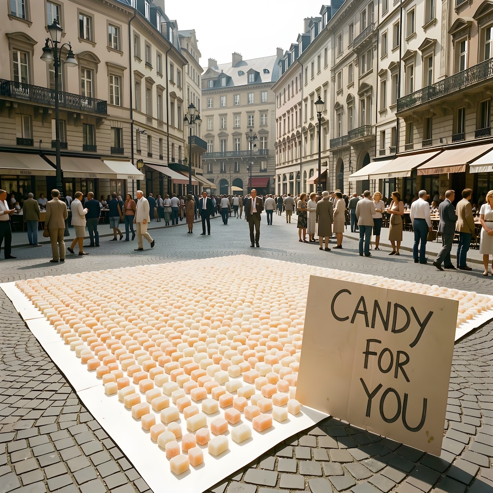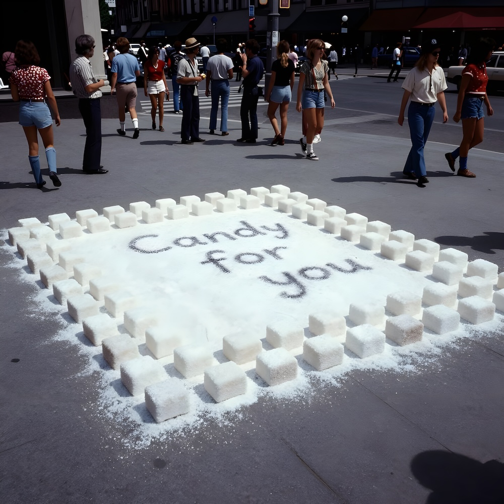 Performance art - 19 July 1979 - On a busy square in the city I laid out about 1000 lumps of sugar in a square. Next to it I wrote “Candy for you”. An AI image for my 'Candy for You' performance. The description above was the prompt for the generated image. An image generated by an AI Machine Learning Model Property of the artist. | ||