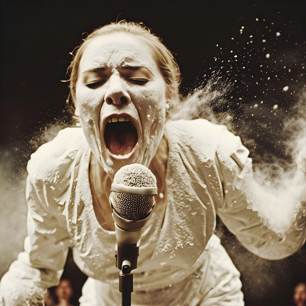 Performance art - 13 January 1980 - During a concert by the band ‘Happy Star/Nominette’ I rolled violently through a heap of flour and screamed as loud as I could in a microphone until I was exhausted.