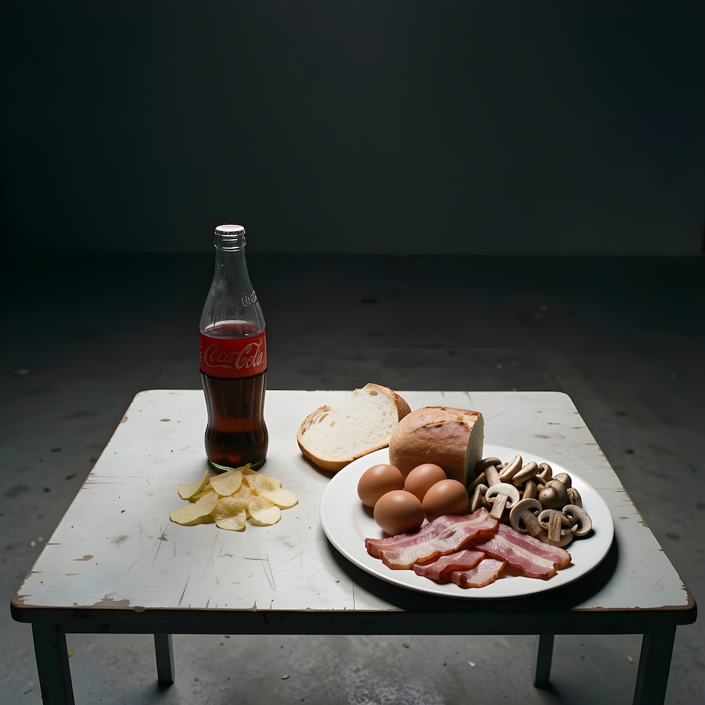 Performance art - 4 August 1980 - For 11 days I lived on 250 grams of chips and 1 liter Coca-Cola a day. The next day I ate half a bread 6 eggs 6 slices of bacon and 250 grams of mushrooms.
