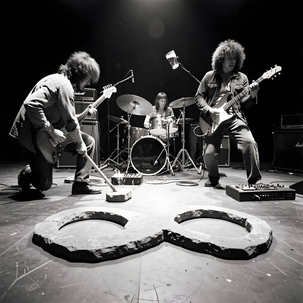 Performance art - 27 September 1980 - While the Simpletones played their music fast I pulled a heavy stone across the floor drawing an eternity-sign. After 20 minutes someone threw a glass of beer over a power-supply and we were cut off.