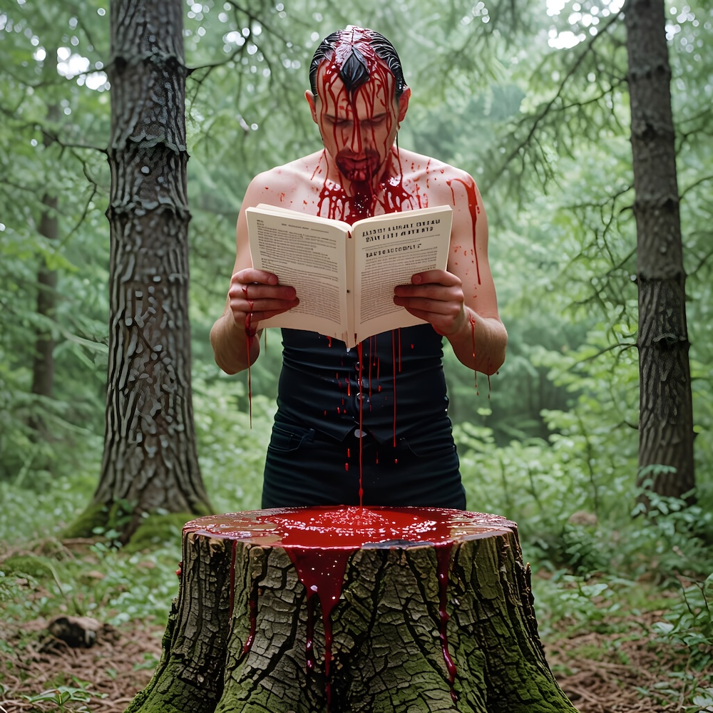 Performance art - 10 June 1983 - Standing on a tree stump I read confessions from multiple murderer and cannibal Karl Friedrich Großmann, then I poured blood over my head and let it run down over my body onto the tree stump. An AI image for my 'Karl Großmann' performance. The description above was the prompt for the generated image. An image generated by an AI Machine Learning Model Property of the artist. | ||