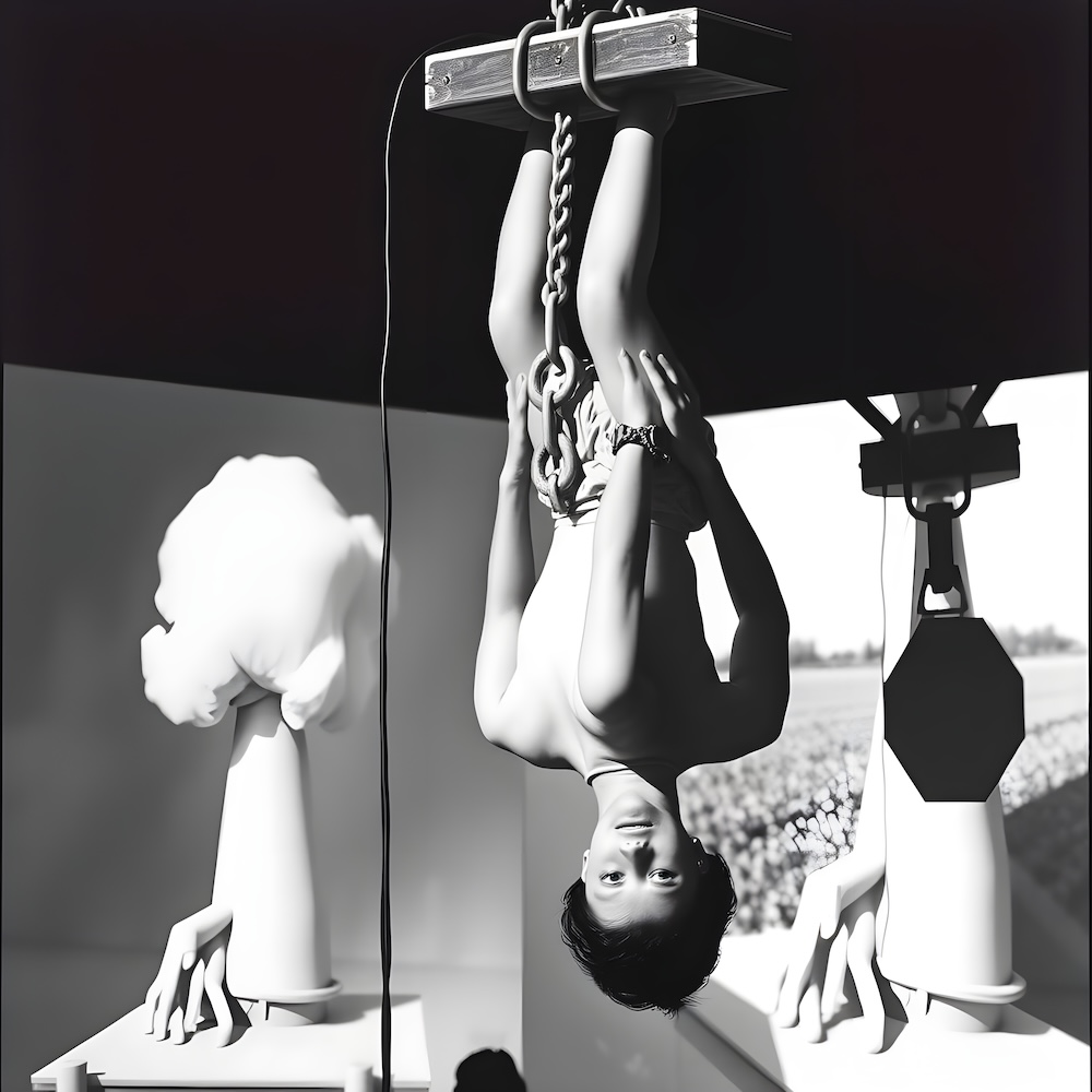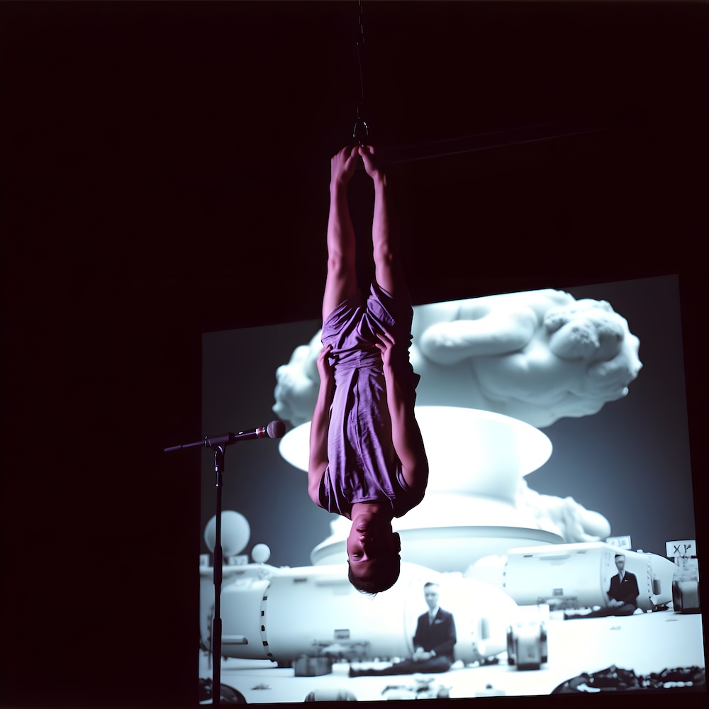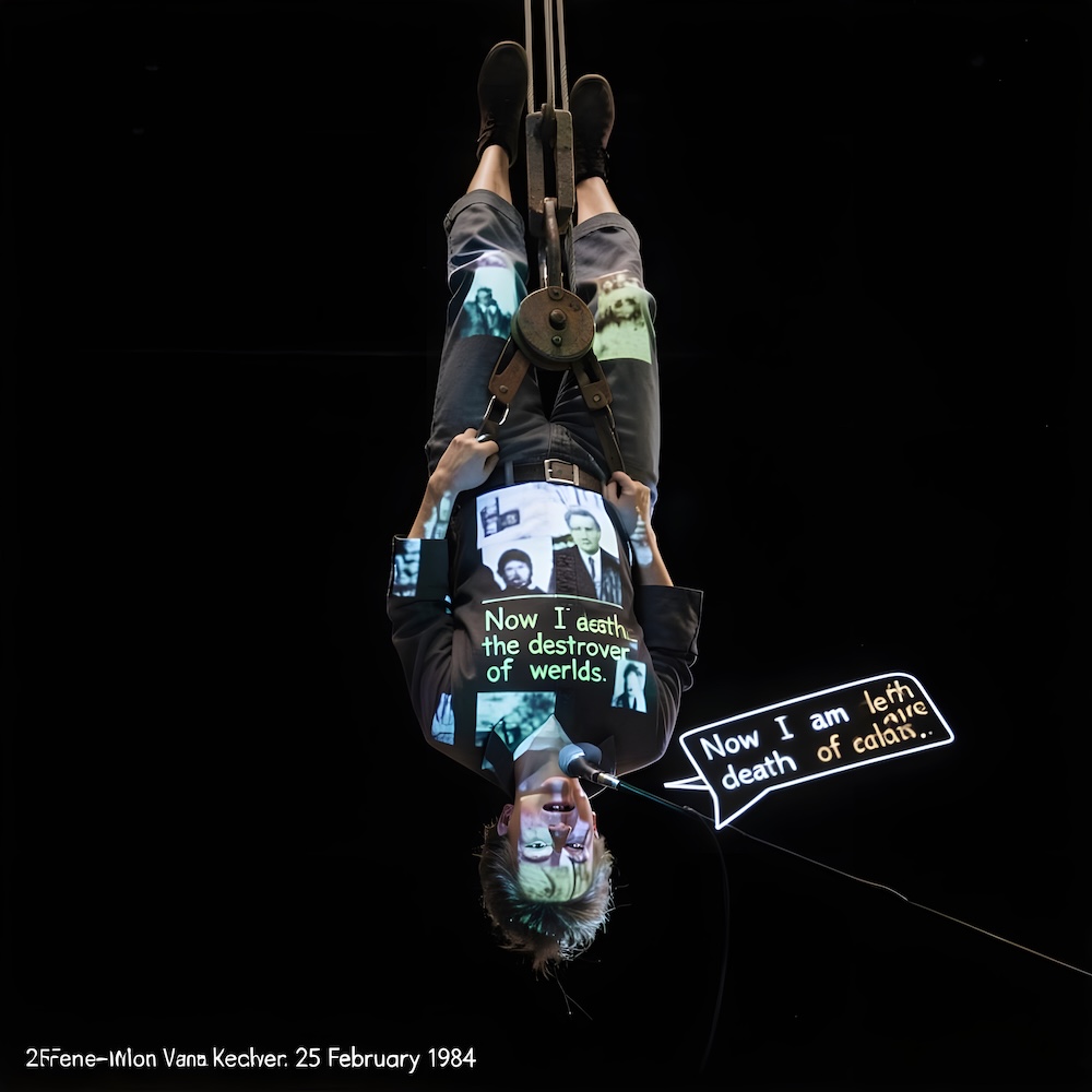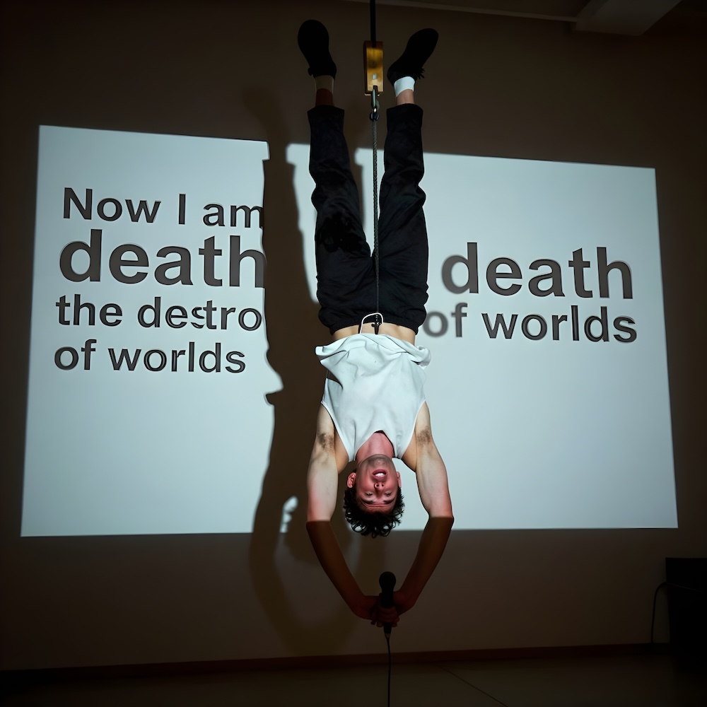 Performance art - 25 February 1984 - I was hanging upside down from a heavy block and tackle while films and slides about Robert Oppenheimer and death were projected onto me. In a microphone I repeated: “Now I am death the destroyer of worlds”. The sound of my voice was electronically distorted into an unearthly grinding and thundering by Anne-Mie Van Kerckhoven. An AI image for my 'Now I Am Death the Destroyer of Worlds - 3' performance. The description above was the prompt for the generated image. An image generated by an AI Machine Learning Model Property of the artist. | ||