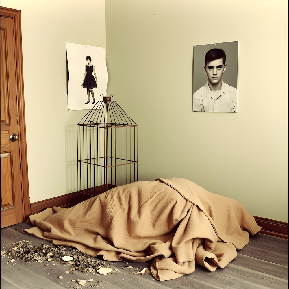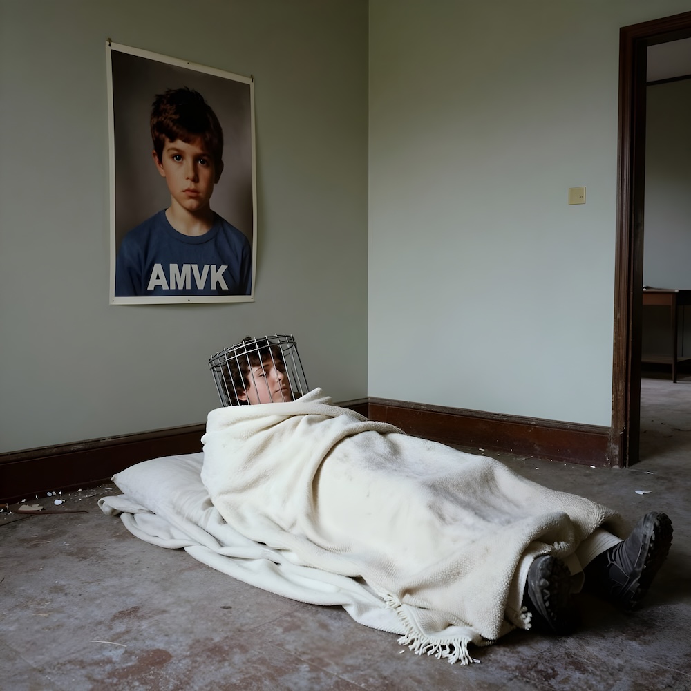 Performance art - 22 September 1984 - In an abandoned house I was laying in a room half covered by a blanket tied up and with my head in a metal cage. On the wall hung a work by AMVK about a kidnapped Italian boy. An AI image for my 'La Chute des Anges Rebelles' performance. The description above was the prompt for the generated image. An image generated by an AI Machine Learning Model Property of the artist. | ||