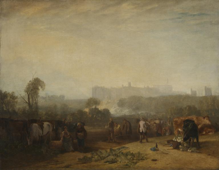Often known as 'Windsor', even in the schedule of the Turner Bequest; Turner's somewhat perverse title suggests that for him the agricultural activity in the foreground was more interesting than the royal castle that looms through the haze behind. The contrast with the earlier ‘Windsor Castle from the Thames’ at Petworth (No.8) could not be more marked and stresses the revolution in Turner's approach to landscape in the few years that had elapsed. Turner made innumerable studies at and around Windsor. In the ‘Windsor and Eton' sketchbook there is a small sketch from the same viewpoint and related but not exactly corresponding drawings of cows and figures (T.B.XCVII-2; 22, 87, 89 etc; 27, 81v, 82v, etc; examples repr. Wilkinson 1974, p.82). This work is also available as a UVprint. Original painting by Turner. An image generated by an AI Machine Learning Model Property of the artist. | ||